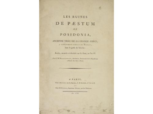 1798 ca. LIBRO. (ARQUEOLOGIA). LES RUINES DE PAESTUM OU POSIDONIA, ANCIENNE VILLE DE LA GRANDE GRÈCE, A VINGT-DEX LIEUES DE NAPLES, DANS LE GOLFE DE SALERNE. Pris: Chez l'Auteur, ann VII (ca 1798). Gran folio. 4 h. + 76 p. + XIV lám. grabadas. Enc. en medio pergamino, puntas, tejuelo, conserva las portadas en rústica para cada parte (texto y planchas).