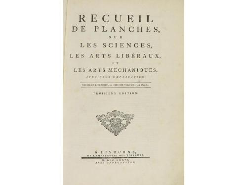 1776. LIBRO. (ARTE). RECUEIL DE PLANCHES, SUR LES SCIENCES, LES ARTS LIBÉRAUX, ET LES ARTS MÉCHANIQUES, AVEC LEUR EXPLICATION. Livourne: Imp. des éditeurs, 1776. Gran folio. 2 h. + 4 h. + 30 lám. grabadas + 9 p. + 49 lám. grabadas. Muchas plegadas o dobles. Leve señal de óxido, puntual. Enc. en pergamino de época, tejuelo, cortes pintados. Las láminas muestran la arquitectura interior de los teatros, distribución de asientos, palcos, escaleras, y también los mecanismos, tramoyas y trampillas para el movimiento de decorados y personajes durante las representaciones.