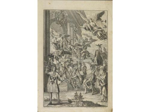 1725. LIBRO. (ARQUITECTURA-FACTICIO). TRIUMPHUS NOVEM SECULORUM IMPREII ROMANO-GERMANICI, CAROLO MAGNO, AUGUSTISSIMO ROMANORUM IMPERATORI, GERMANIAE... Augustae-Vincelicorum [Augsburgo]: Typis Joannis Jacobi Lotteri, 1725. Gran folio. Frontis grabado + portada con capitales xilografiadas + 1 h. + 10 grabados acompañados de una o dos h. explicativas de texto. Sin numerarar. Todos los grabados a plena página, arquitectónicos. [Sigue:] BASILICA CAROLINA OPUS GRANDE. Portada + 80 p. y 13 lám. (la mayoría dobles). [Sigue:] ALTARIA ET SACELLA VARIA TEMPLORUM ROMAE... Noribergae: Apud. Ioh. Iacobum de Sandrart. Colección de XL lám. grabadas de iconografía de diferentes templos de Roma, la última es el índice de las imágenes. [Sigue:] XI lám. grabadas + 4 lám. grabadas + 3 lám. grabadas + 4 lám. grabadas + 4 lám. de puertas grabadas + 4 lám. de balcones grabadas + 6 lám. de púlpitos elevados grabadas + 4 lám. de pared con chimenea grabadas + 4 lám. de bibliotecas grabadas + 4 lám. de decoración de órganos grabadas + 4 lám. de decoraciones de coro y atriles grabadas + 4 lám. de adornos de puertas y ventanas grabadas. Todas estas láminas de iglesias y templos de la ciudad de Roma. Enc. en cartoné papel al agua, tejuelo de papel, puntas y cantos rozados. Volumen facticio que reúne varias colecciones de grabados sobre decoración interna de templos barrocos de la ciudad de Roma. Grabados con gran precisión por diferentes artistas sobre buen y recio papel de hilo.