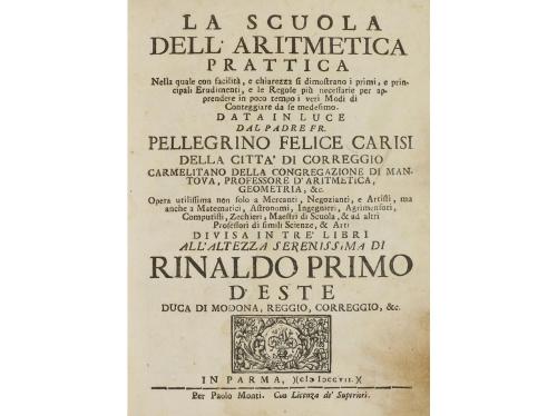 1707. LIBRO. (ARQUITECTURA). LA SCUOLA DELL'ARITMETICA PRATTICA NELLA QUALE CON FACILITÀ, E CHIAREZZA SI DIMOSTRANO I PRIMI, E PRINCIPALI ERUDIMENTI... Parma: Per Paolo Monti, 1707. 4º menor. XXIV + 232 p. Escudo xilográfico en la portada y cabecera al principio de texto. Con numerosos ejemplos matemáticos en el texto. Cerco de humedad en la primera parte de la obra. Enc. en medio pergamino de época, planos de cartoné, tejuelo. Primera edición.