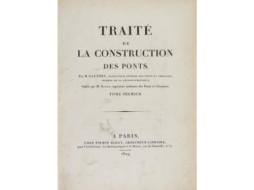 1809-1813. LIBRO. (INGENIERÍA). TRAITÉ DE LA CONSTRUCTION DES PONTS. Paris: Chez Firmin Didot, 1809-1813. 2 vol. en 4º mayor. I: XXXI + 403 p. + XVI lám. plegadas. II: 2 h. + 399 p. + XI lám. plegadas. Dos vol. enc. en media piel, puntas, planos de cartoné, cantos y puntas rozadas, tejuelo, cortes pintados, lomeras craqueladas. Ex-libris. Tratado sobre la construcción de puentes que recoge los estudios de autores clásicos como Palladio, Albert, Serlio o Blondel. Estudia el flujo del agua bajo las estructuras y la fuerza que esta ejerce sobre los elementos.