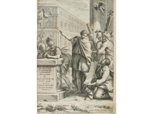 1656. LIBRO. (ARQUITECTURA). DE BASILICA ET PATRIARCHIO LATERANENSI LIBRI QUATUOR AD ALEXANDRUM VII PONT. MAX. Romae: Typis Ignatii de Lazzeris, 1656. Folio menor. 14 h. (incluida la portada grabada) + 387 p. + 13 h. y 7 lám. (una de ellas laminada). Capitales xilográficas, sencillos culs-de-lampe. Enc. en pergamino rígido tejuelo. Papel algo tostado en algunos pliegos, pero en general buen ejemplar, buen papel y amplios márgenes. Única edición de esta pieza, escasea en el mercado.