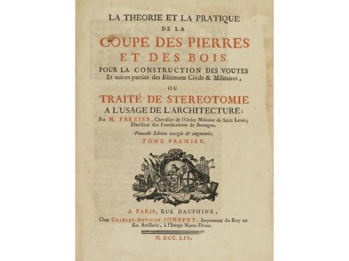 1754. LIBRO. (INGENIERÍA-ARQUITECTURA). LA THEORIE ET LA PRATIQUE DE LA COUPE DES PIERRES ET DES BOIS POUR LA CONSTRUCTION DES VOUTES ET AUTRES PARTIES DES BÂTIMENS CIVILS & MILITAIRES OU TRAITÉ DE STEREOTOMIE A L'USAGE DE L'ARCHITECTURE. Paris: Chez Charles-Antoine Jombert, 1754. 3 vol. en 4º menor. I: XXXVIII p. + 1 h. + 476 p. II: 10 h. + 503 p. III: 8 h. + 417 p . + 65 p. + 1 h. Ilustrados con 114 lám. plegadas (en realidad 115 pues hay 2 bis). Cada vol. con la portada a dos tintas y una cabecera grabada. Algunos pliegos de papel tostado o ligeramente oscurecido. Tres vol. enc. en plena piel, nervios, cortes pintados, cantos y cajos rozados, pero de buena presencia. Ex-libris.