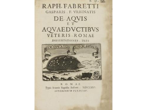 1680. LIBRO. (ARQUITECTURA CIVIL). DE AQUIS ET AQUAEDUCTIBUS VETERIS ROMAE. Romae: Typis Ioannis Baptistae Bussotti, 1680. 4º menor. 193 p. + 11 h. Con tres mapas plegados y numerosos grabados en el texto. Cercos de suciedad en las primeras hojas y leve sombra de óxido. Enc. en pasta española, nervios, cortes jaspeados, pequeña falta en la lomera. Tratado sobre los acueductos romanos, realizado por el conservador de los archivos del Castillo de Sant'Angelo. Un tratado de arquitectura civil romana.