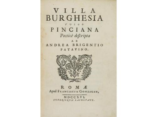 1716. LIBRO. (ARQUITECTURA). VILLA BURGHESIA VULGO PINCIANA POETICÈ DESCRIPTA. Romae: Apud Franciscum Gonzagam, 1716. 8º mayor. 6 h. + 96 p. y 26 lám. Texto con apostillas marginales. Cubiertas de cartóne, sin lomera. Primera edición de esta obra, dedicada a la descripción de la Villa Borghese. Es un detallado relato descriptivo, escrito por el que fue custodio de la villa.