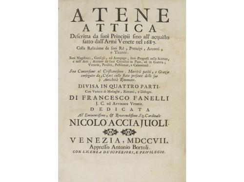 1707. LIBRO. (ARQUEOLOGÍA). ATENE ATTICA DESCRITTA DA SUOI PRINCIPII FINO ALL'ACQUISTO FATTO DALL'ARMI VENETE NEL 1687. Venezia: Apresso Antonio Bortoli, 1707. 4º. Frontis grabado + 4 h. (incluido retrato) + 386 p. + 1 h. Ilustrado con 14 grabados calcográficos, cinco de ellos plegados con vistas de la acrópolis y el relato del bombardeo de 1687. Cabeceras y capitales calcográficas al principio de cada parte, medallas grabadas en el texto. Buen ejemplar marginoso, muy leve sombra de óxido. Leve cerco de humedad en la esquina de las primeras hojas. Enc. en pergamino de época, pequeña falta en la esquina del plano anterior, tejuelo, cortes pintados. PRIMERA EDICIÓN de la historia de Atenas relatada desde sus orígenes hasta 1687, cuando se puso fin a la ocupación otomana. Brunet, II/1176.