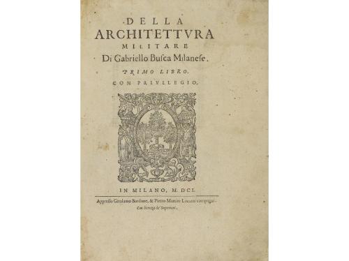1601. LIBRO. (ARQUITECTURA). DELLA ARCHITETTURA MILITARE. Milano: Apresso Girolamo Bordone & Pietro Martire Locarni, 1601. 4º. 6 h. + 299 p. Ilustr. con xilografías en el texto y 5 lám. xilográficas plegadas, fuera de texto. Cabeceras y capitales xilografiadas. Algún cerco de humedad y manchita oleosa en el margen de pocas pp. Enc. en media piel, puntas, nervios, tejuelo. Buen ejemplar, con todos sus márgenes. PRIMERA EDICIÓN. Además del interés desde el punto de vista de arquitectura militar, Busca hace un intento por identificar a los principales maestros del s. XVI de este tipo de arquiectura así como sus mecenas. La obra habla de Belucci, Pietro y Hieronimo Carpi, Tartaglia y Teti, etc.