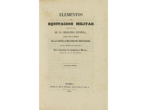 1853. LIBRO. (EQUITACIÓN). ELEMENTOS DE EQUITACION MILITAR PARA EL USO DE LA CABALLERIA ESPAÑOLA, ESCRITOS PARA LOS ALUMNOS DE LA ESCUELA MILITAR DE EQUITACION. Madrid: Imp. de José M. Ducazcal, 1853. 4º. VII p. y vuelta + 224 p. y 13 láminas. Alguna anotación a lápiz. Enc. de época en media piel reciente, nervios, corte superior dorado.