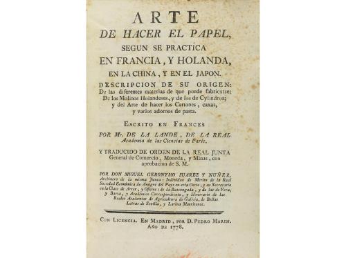 1778. LIBRO. (ARTE-FABRICACIÓN). ARTE DE HACER EL PAPEL, SEGUN SE PRACTICA EN FRANCIA, Y HOLANDA, EN LA CHINA, Y EN EL JAPON. DESCRIPCION DE SU ORIGEN. Traucción de Miguel Geronymo Suárez y Núñez. Madrid: Imp. Pedro Marin, 1778. 8º mayor. 6 h. + 284 p. y 15 lám. plegadas, alguna con pequeña rasgadura pero sin pérdida. Ligera señal de óxido. Enc. en pergamino de época, rígido, tejuelo, cortes pintados.