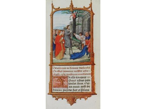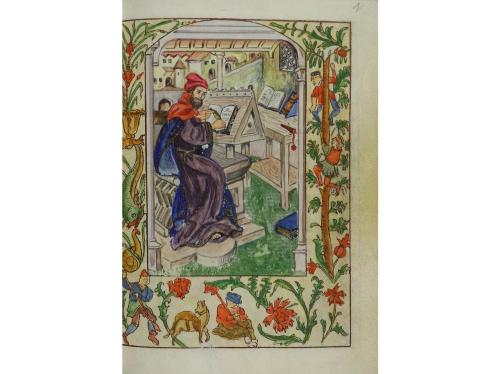 s. XIX. LIBRO. (FACSÍMIL). CREDO ILUMINADO DE SIR DE JOINVILLE. Manuscrito sobre pergamino en un vol. en 8º menor. Sin paginar. Todas las hojas iluminadas a mano, en orla o con ilustraciones a plena página. En francés. Enc. en pergamino, tejuelo, presentado en una petaca de cartoné.