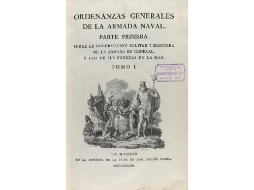 1793. LIBRO. (DERECHO MARÍTIMO). ORDENANZAS GENERALES DE LA ARMADA NAVAL. Madrid: Imp. Vda. de Joachin Ibarra, 1793. 2 vol. en 4º mayor. I: 2 h. + 518 + L p. II: 2 h. + 574 + LIV p. Viñetas grabadas por A. Carnicero y F. Selma. Ejemplar limpio aunque pequeño cerco de humedad en las dos primeras hh. del segundo vol. Sello húmedo de antiguo poseedor. Dos vol. enc. en pasta española, nervios, doble tejuelo y cortes pintados, puntas rozadas. Palau 202627, dice de ella que es una bella edición e impresión, como la mayoría de las piezas de las prensas de Ibarra.