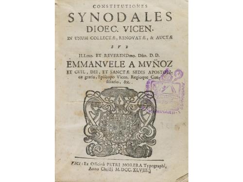 1748. LIBRO. (DERECHO CANÓNICO). CONSTITUTIONES SYNODALES DIOEC. VICEN. IN UNUM COLLECTAE, RENOVATAE, & AUCTAE... Vici: Ex Officinâ Petro Morera, 1748. 8º. 4 h. + XXXII p. + 132 p. + CCXLVIII p. + 10 h. Capitales xilográficas. Texto a línea tirada. Señal de óxido. Enc. en pergamino de época, lomera rotulada.