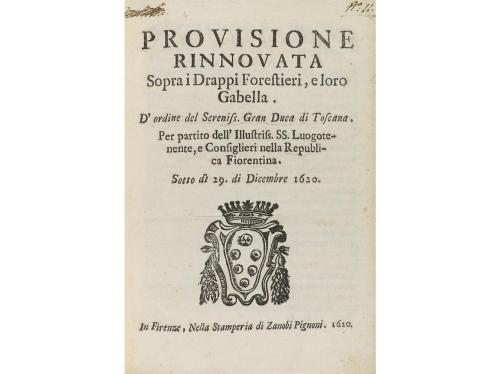 1620. LIBRO. (COMERCIO-TEXTIL). PROVISIONE RINNOVATA SOPRA I DRAPPI FORESTIERI, E LORO GABELLA. D'ORDINE DEL SERENISS. GRAN DUCA DI TOSCANA. Firenze: Nella Stamperia di Zanobi Pignoni, 1620. 8º mayor. 8 h. Grabado xilográfico en la portada. Enc. en tela reciente, tejuelo en el plano anterior.