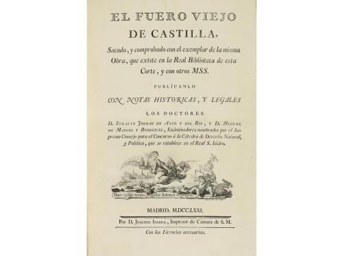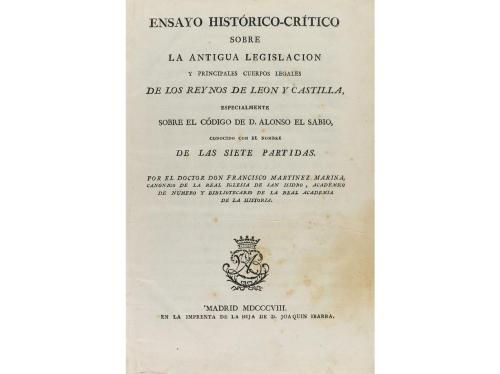 1808. LIBRO. (DERECHO). ENSAYO HISTÓRICO-CRÍTICO SOBRE LA ANTIGUA LEGISLACION Y PRINCIPALES CUERPOS LEGALES DE LOS REYNOS DE LEON Y CASTILLA, ESPECIALMENTE SOBRE EL CÓDIGO DE D. ALONSO EL SABIO, CONOCIDO CON EL NOMBRE DE LAS. Madrid: Imp. Hija de D. Joaquin Ibarra, 1808. 4º. 2 h. + 450 p. Muy ligera señal de óxido. Anotaciones marginales manuscritas. Enc. en pasta española, tejuelo, planos rozados.