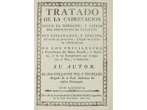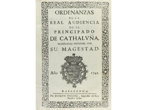 1742. LIBRO. (DERECHO- CATALUÑA). ORDENANZAS DE LA REAL AUDIENCIA DE EL PRINCIPADO DE CATHALUÑA. MANDADAS IMPRIMIR POR SU MAGESTAD. Barcelona: Joseph Texido, impresor del Rey, 1742. 4º. 3 h. + 144 p. + 2 h. En la portada orla tipográfica y escudo real grabado en madera. Capitales y culs-de-lampe xilografiadas. Texto a dos columnas con apostillas marginales. Enc. en pergamino de la época con título rotulado en el lomo. Muy buen ejemplar. Edición original. En 1716, Felipe V, instauró un nuevo tribunal dentro del Principado, para las causas tanto civiles como criminales, y también para lo gubernativo. Palau 202661.