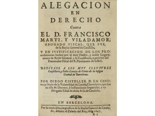 1647. LIBRO. (DERECHO-CATALUNYA). ALEGACION EN DERECHO CONTRA EL D. FRANCISCO MARTI Y VILADAMOR, ABOGADO FISCAL, QUE FUE, DE LA BAYLIA GENERAL DE CATALUÑA. Barcelona: Viuda Déu, Impressora de la Baylia General de Cataluña, 1647. 8º mayor. Escudo xilográfico a modo de frontis + 8 h. + 129 p. + 2 h. Cabeceras xilográficas. Texto con apostillas marginales, algo corto de márgenes. Enc. reciente en plena piel con hierros dorados en ambos planos, hilos, cantos cejas, nevios, lomera cuajada, cortes dorados. Escudo en mosaico de tres colores de piel, en ambos planos, guardas de seda. La obra recopila las acusaciones contra el abogado Francisco Martí y Viladamor, por su adhesión a la ocupación francesa en 1640. CCPB 489925-3. Palau 54997.