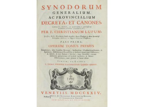 1724. LIBRO. (DERECHO CANÓNICO). SYNODORUM GENERALIUM, AC PROVINCIALIUM DECRETA, ET CANONES, SCHOLIIS, NOTIS, AC HISTORICA ACTORUM DISSERTATIONE ILLUSTRATI. Venetiis: Apud. Baptistam Albritium Q. Hieron. et Sebastianum Coleti, 1724. Folio. 16 h. + 420 p. 1 h. Portada a dos tintas, retrato grabado al verso de la portadilla. [Sigue:] ID. TOMUS SECUNDUS. Id. 8 h. + 395 p. Capitales, cabeceras y culs-de-lampe xilográficos. Texto a dos columnas. Dos tomos enc. en un vol. en pergamino de época, nervios, cortes pintados.
