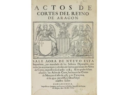 1608. LIBRO. (DERECHO-ARAGÓN). ACTOS DE CORTES DEL REYNO DE ARAGON. Çaragoça: Lorenço de Robles, 1608. Folio menor. 8 h. + 92 fol. + 5 h. Sin la última blanca. Texto a dos columnas, apostillas marginales. Capitales, cabeceras y culs-de-lampe xilográficos. Algún cerco marginal de humedad. Bonita enc. de época en plena piel, hilos y hierros dorados y escudo de Aragón dorado en ambos planos, nervios, cortes dorados, restauración en una punta. CCPB 32728-X.