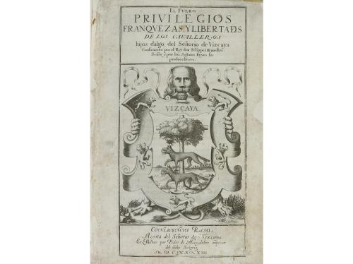 1643. LIBRO. (DERECHO-VIZCAYA). EL FUERO. PRIVILEGIOS, FRANQUEZAS Y LIBERTADES DE LOS CAVALLEROS HIJOS DALGO DEL SEÑORÍO DE VIZCAYA. En Bilbao: por Pedro de Huydobro, 1643. Cuarto mayor. 3 h. + 134 p. (en realidad 132 por error tipográfico) + 15 h. Texto a dos columnas. Restauraciones de galerías, portada laminada. Enc. en pergamino reciente, plano anterior rotulado, cierres de badana. CCPB 52628-2.