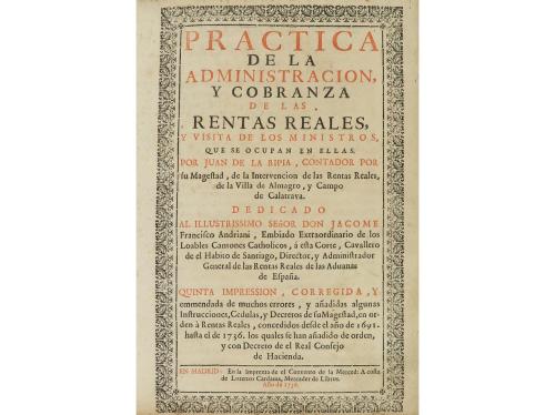 1736. LIBRO. (ECONOMÍA). PRACTICA DE LA ADMINISTRACION, Y COBRANZA DE LAS RENTAS REALES, Y VISITA DE LOS MINISTROS, QUE SE OCUPAN EN ELLAS. Madrid: Imp. Convento de la Merced, 1736. 4º mayor. 16 h. + 387 p. Hojas de índice traspuestas al principio de la obra. Portada a dos tintas, en orla xilográfica. Capitales, cabeceras y culs-de-lampe xilográficas. Texto con apostillas marginales. Rastro de suciedad. Enc. en pergamino de época, algo mareado. Ejemplar enriquecido con la carta manuscrita de Martín Gutiérrez, conde relata que en abril de 1798 había celebrado misa en la catedral de Burgos por primera vez.