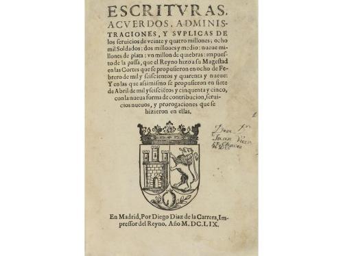 1659. LIBRO. (ADMINISTRACIÓN). ESCRITURAS, ACUERDOS, ADMINISTRACIONES, Y SUPLICAS DE LOS SERVICIOS DE VEINTE Y QUATRO MILLONES: OCHO MIL SOLDADOS: DOS MILLONES Y MEDIO: NUEVE MILLONES DE PLATA: UN MILLON DE QUIEBRAS... 8 de febrero. Madrid: Diego Diaz de la Carrera, 1659. 4º mayor. 6 h. + 215 fol. + 1 b. + 2 h- + 9 fol. + y una separata de 4 h. impresas. Texto con apostillas marginales. Algo corto de márgenes. Ejemplar restaurado. Ex-libris manuscrito de antiguo propietario. Enc. en pergamino de época, restaurado. CCPB000689325-2. La recaudación de la que se dan profusión de detalles en el libro, debe enmarcarse en la guerra franco-española, que tiene lugar en el período comprendido entre 1635 y 1659, año en el que finaliza con el acuerdo firmado entre ambos países conocido como la Paz de los Pirineos.