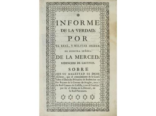 1731. LIBRO. (LEGALIZACIÓN ORDEN MERCED). INFORME DE LA VERDAD POR EL REAL, Y MILITAR ORDEN DE NUESTRA SEÑORA DE LA MERCED, REDENCION DE CAUTIVOS SOBRE QUE SU MAGESTAD SE DIGNE DECLARAR... [Madrid: Editado por la Orden. Jose Nicolas Cavero?], 1731 (al final de la obra). 4º mayor. 4 h. + 374 p. + XV p. Viñetas y capitales xilográficos, portada en orla. Texto con apostillas marginales. Enc. en pergamino de época. La obra recoge el recurso ante el rey para la legalización de la orden, que venía ocasionado por un conflicto entre Castilla y Aragón. CCPB 1389680-6.