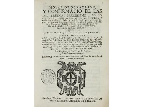 1695. LIBRO. (DERECHO). NOVAS ORDINACIONS Y CONFIRMACIO DE LAS DEL TRIENNI PRECEDENT, AB LA EXPLICACIO, ESMENA, O RESTRICCIO DE ALGUNAS, Y CRIDAS FETAS... Barcelona: Rafel Figueró, 1695. 8º mayor. 6 h. + 72 p. + 2 h. + 154 p. + 1 h. Enc. en pergamino de época. Plano anterior y lomera con falta.