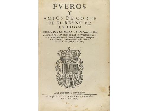 1678. LIBRO. (DERECHO- ARAGÓN). FUEROS Y ACTOS DE CORTE DE EL REYNO DE ARAGON HECHOS POR LA SACRA, CATOLICA, Y REAL MAGESTAD DEL REY DON CARLOS II... EN CALATAYUD. Zaragoça: Imp. Pasqual Bueno, 1678. Folio. 2 h. + 36 fol. Texto a dos columnas, con capitales y escudo xilográfico en la portada. Enc. en pergamino reciente. Ejemplar enriquecido con una larga nota manuscrita en la primera h. blanca, en caligrafía de época donde se relata la solicitud de permiso para imprimir los presentes fueros, esta tiene restauraciones marginales.