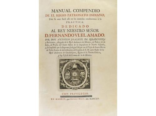 1755. LIBRO. (COLONIAS). MANUAL COMPENDIO DE EL REGIO PATRONATO INDIANO, PARA SU MAS FACIL USO EN LAS MATERIAS CONDUCENTES À LA PRACTICA. Madrid: Antonio Marin, 1755. 4º mayor. Potada a dos tintas con grabado tipográfico, un grabado retrato del rey con dos figuras alegóricas + 22 h. + 531 p. Cabeceras grabadas, culs-de-lampe xilográficos. Papel muy limpio, bonita y clara impresión. Enc. en pasta española nervios, tejuelo, lomera cuajada, cortes pintados. Palau 266572. CCPB 193460-0.