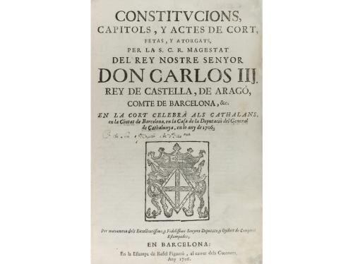 1706. LIBRO. (DERECHO- CATALÁN). CONSTITUCIONS, CAPITOLS, Y ACTES DE CORT, FETAS, Y ATORGATS, PER LA S.C.R. MAGESTAT DEL REY NOSTRE SENYOR DON CARLOS III REY DE CASTELLA, DE ARAGO, COMTE DE BARCELONA, & C. Rey de Castella, de Aragó,. Barcelona: Estampa de Rafel Figuerò, 1706. Folio menor. 6 h. + 196 p. Capitales y cabeceras xilográficas. Portada ilustrada con escudo xilográfico. Restauración en alguna punta y de finas galerías marginales, puntual. Enc. en pergamino de época, lomera rotulada. Palau 60387.