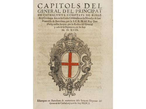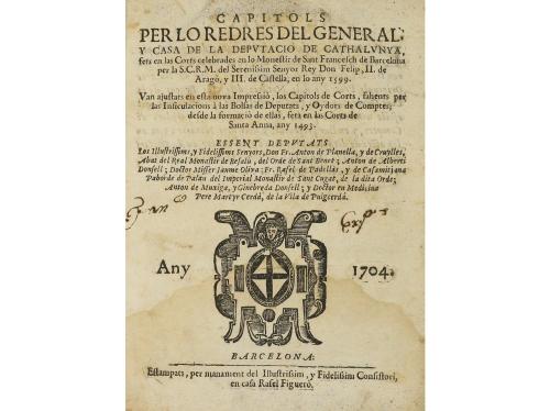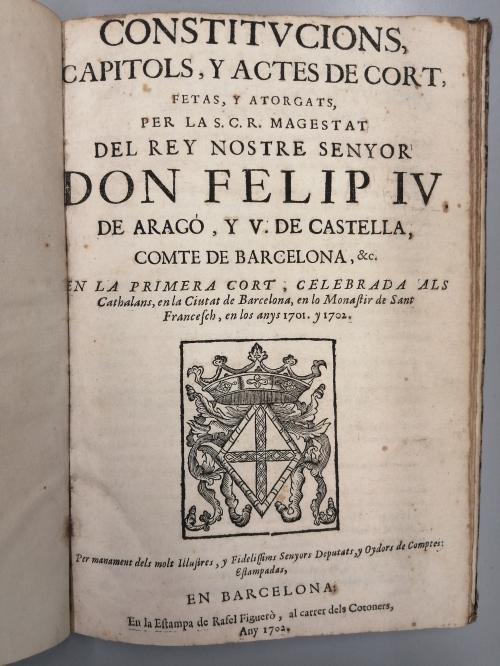 1702. LIBRO. (DERECHO CATALÁN). CONSTITUCIONS, CAPITOLS, Y ACTES DE CORT, FETAS, Y ATORGATS, PER LA S.C.R. MAGESTAT DEL REY NOSTRE SENYOR DON FELIP IV DE ARAGÓ, Y V. DE CASTELLA, COMTE DE BARCELONA... Barcelona: En la Estampa de Rafel Figuerò, 1702. Folio menor. 6 h.+ 100 p. Ilustr. con el escudo de la Diputación de Barcelona xilografiado en la portada. Algo corto de márgenes y ligera señal de óxido. Enc. en medio pergamino de época, planos algo rozados. Palau 60387.