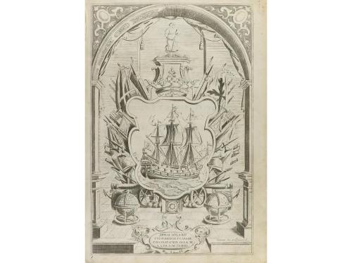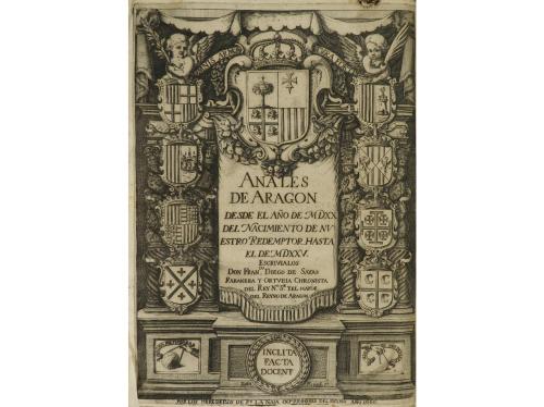 1666. LIBRO. (DERECHO. ARAGÓN). ANALES DE ARAGON DESDE EL AÑO MDXX DEL NACIMIENTO DE NUESTRO REDEMPTOR HASTA MDXXV. S. l. [Zaragoza]: Herederos de Pº. La Naja, 1666. Folio menor. Portada calcográfica con orla arquitectónica con escudos, grabada por Iuan Rened + 18 h. + 840 p. + 29 h. Capitales y culs-de-lampe xilografiadas. Texto a dos columnas, con apostillas mariginales. Papel muy ligeramente tostado, algo corto de márgenes. Enc. en pergamino de época con la lomera restaurada y rotulada. Los primeros cuatro capítulos dedicados a América, después se ocupa de la conquista de México y la circunnavegación de Magallanes y Elcano. Palau 303368.