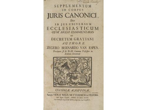 1732. LIBRO. (DERECHO CANÓNICO). SUPPLEMENTUM IN CORPUS JURIS CANONICI, SIVE IN JUS UNIVERSUM ECCLESIASTICUM CUM BREVI COMMENTARIO AD DECRETUM GRATIANI. Coloniae Agripinae: Sumpt. Viduae Wilh. Metternich & Filii, 1732. Folio mayor estrecho. 2 h. + 194 p. + 170 p. + 5 h. Texto a dos columnas. Grabado xilográfico en la portada. Papel tostado. Enc. en pergamino, lomera rotulada de época.