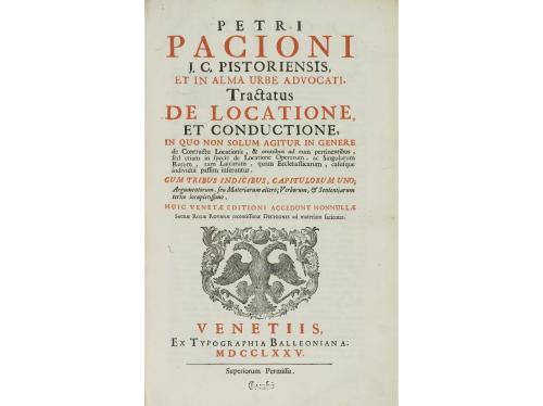 1775. LIBRO. (DERECHO). TRACTATUS DE LOCATIONE, ET CONDUCTIONE, IN QUO NON SOLUM AGITUR IN GENERE DE CONTRACTU LOCATIONIS, & OMNIBUS AD EUM PERTINENTIBUS... Venetiis: Typ. Balleoniana, 1775. Folio. 12 h. + 362 p. + 84 p. Enc. pergamino rígido de época, puntas y cantos rozados, cortes pintados, tejuelo.