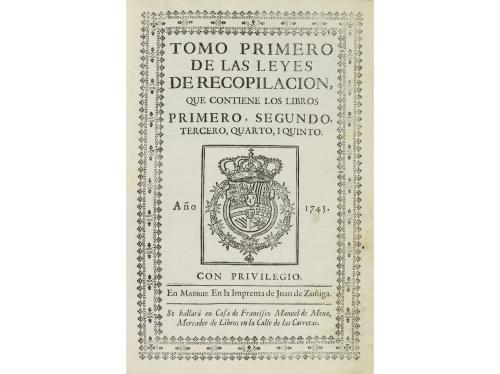 1745. LIBRO. (DERECHO). TOMO PRIMERO DE LAS LEYES DE RECOPILACION, QUE CONTIENE LOS LIBROS PRIMERO, SEGUNDO, TERCERO, QUARTO I QUINTO. Madrid: Imp. Juan de Zuñiga, 1745. 4º mayor. 6 h. + 839 p. Texto a dos columnas. Portada en orla xilográfica y con escudo real. Cabecera xilográfica. CCPB 204915-5. [Sigue:] TOMO SEGUNDO DE LA RECOPILACIÓN... LIBROS SEXTO, SEPTIMO, OCTAVO Y NONO. Id.: Imp. Herederos de la Viudad de Juan Garcia Infanzòn, 1745. 4º mayor. 2 h. + 768 p. + 152 p. Esta seguna numeración corresponde al índice. Texto a dos columnas. CCPB 73615-5. Ejemplares limpios. Ambos vol. enc. en pergamino de época, lomeras rotuladas.