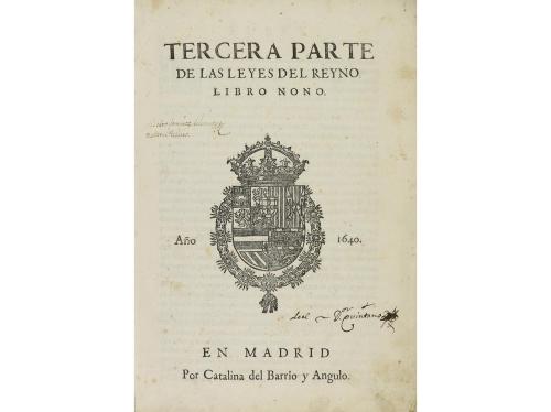1640. LIBRO. (DERECHO). RECOPILACION DE LAS LEYES DESTOS REYNOS, HECHA POR MANDADO DE LA MAGESTAD CATOLICA DEL REY DON FELIPE SEGUNDO NUESTRO SEÑOR... Madrid: Imp. Catalina de Barrio y Angulo y Diego Diaz de la Carrera, 1640. 3 vol. en 4º mayor. I: 4 h. + 394 fol. Comprende los primeros cuatro libros (algún error de paginación pero completo). II: SEGUNDA PARTE DE LAS LEYES. LIBRO QUINTO. Id. Imp. Diego Díaz de la Carrera, 1640. 3 h. + 376 fol. Cerco oleoso en la esquina de las primeras hojas, algún punto ocasional de óxido. III: TERCERA PARTE DE LAS LEYES DEL REYNO. LIBRO NONO. Id. Imp. Catalina del Barrio y Angulo, 1640. 2 h. + 198 fol. [Sigue:] REPERTORIO DEL INDICE DE LA NUEVA RECOPILACION DE LAS LEYES DEL REYNO. Id. Imp. Diego Díaz de la Carrera, 1641. 7 h. + 88 fol. Algún cerco sucio de humedad. Tres vol. con el texto a dos columnas, capitales y culs-de-lampe xilografiados. Anotaciones manuscritas de época. Texto con apostillas marginales. Varias marcas de propiedad manuscritas en las portadas. Tres vol. enc. en pergamino de época con lomeras rotuladas, la enc. del tercero semidesprendida. Difícil encontrar con todos los volúmenes. Palau 252510. CCPB 40626-0. La impresora Catalina de Barrio y Angulo figura en el pie de imprenta de varias obras a partir de 1640, tras la muerte de su segundo marido, y así aparece al menos hasta 1645.