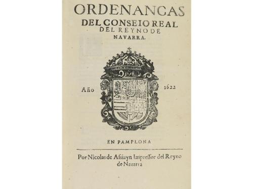 1622. LIBRO. (DERECHO-NAVARRA). ORDENANCAS DEL CONSEIO REAL DEL REYNO DE NAVARRA. Pamplona: Imp. Nicolas de Assiayn, 1622. 4º. 6 h. (de las que son facsímil la portada, la siguiente y la última de la tabla)+ 617 p. Texto a dos columnas y apostillas marginales. Errores de paginación. Remarginaciones de antiguo en las primeras hojas, algo toscas. Muy corto de margen superior y moteado de óxido. Enc. en pasta española, tejuelo, nervios, cortes pintados, cantos rozados, leve peladura en una punta. CCPB 206483-9. Palau 203119.