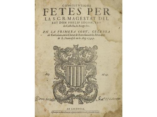 1603. LIBRO. (DERECHO). COSTITUTIONS FETES PER LA S. C. R. MAGESTAT DEL REY DON PHELIP SEGON, REY DE CASTELLA, DE ARAGO &. en la primera cort, celebra als cathalans, en la ciutat de Barcelona en lo Monastir de S. Francesc en. Barcelona: Est. en casa de Gabriel Graels y Giraldo Dotil, 1603. 4º mayor. 8 h. + LXVI fol. (falta el último folio). Cerco de suciedad en la portada las primeras hojas. Enc. en pergamino de época.