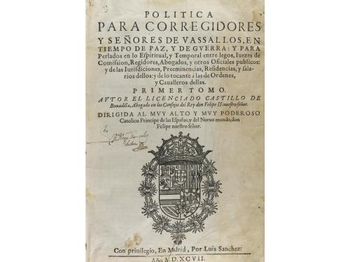 1697. LIBRO. (NOTARÍA). POLITICA PARA CORREGIDORES Y SEÑORES DE VASSALLOS, EN TIEMPO DE PAZ, Y DE GUERRA: Y PARA PRELADOS EN LO ESPIRITUAL, Y TEMPORAL ENTRE LEGOS... Madrid: Imp. Luis Sanchez, 1597. 2 vol. en 4º mayor. I: 89 h. + 1284 p. II: Sin la portada, 66 h. + 1154 p. Con una nota manuscrita de época al final del segundo vol. Texto a dos columnas, con apostillas marginales. Dos vol. enc. en pergamino de época, con la lomera rotulada.