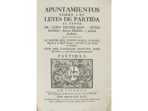 1759. LIBRO. (DERECHO). APUNTAMIENTOS SOBRE LAS LEYES DE PARTIDA AL TENOR DE LEYES RECOPILADAS, AUTOS ACORDADOS, AUTORES ESPAÑOLES, Y PRACTICA MODERNA. Valencia: Herederos de Geronimo Conejos, 1759. 3 vol. en folio menor. I: Partida I. Portada + dos retratos y un escudo heráldico grabados por Thomas Planes + 8 h. + 204 p. [Sigue:] Partida II. 2 h. + 187. II: Partida III. 2 h. + 261 p. [sigue:] Partida IV.2 h. + 98 p. [Sigue:] Partida V. 2 h. + 130 p. III: Partida VI. 2 h. + 100 p. [Sigue:] Partida VII. 2 h. + 201 p. Texto a dos columnas. Cabeceras, capitales y culs-de-lampe. Ligera señal de óxido. Tres vol. enc. en pergamino de época, lomera rotulada. Palau 28299.