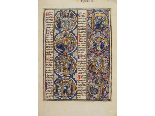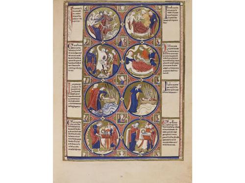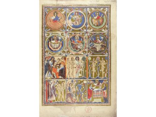 1997. LIBRO. (FACSÍMIL). BIBLIA MORALIZADA DE SAN LUIS. Madrid: Ed. Casariego, 1997. Dos vol. en Folio mayor. El facsímil contiene una reproducción de la obra en papel imitación de pergamino y está enc. en plena piel ante, con decoraciones en hierros secos en ambos planos. Edición numerada y limitada a 495 ejemplares. Con el libro de estudio, presentados ambos en una petaca de cartoné. La también llamada "Biblia Rica" de Toledo fue pensada para la formación del rey francés Luís IX. Debía tener todos los lujos que se puedan acumular en un libro. Posteriormente pasó a posesión de Alfonso X. Sabemos que se escribió entre 1226 y 1234. Actualmente se conserva en la catedral de Toledo a excepción de estas hojas.