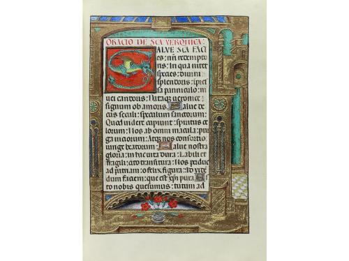 1999. LIBRO. (FACSÍMIL). FLORILEGIO DE ORACIONES DE RENATA DE FRANCIA. Madrid: Ars Millenii, 1999. 12º. 28 h. de facsímil, páginas orladas con abund. dorados. Enc. en tercipelo rosa con cierres. Edición numerada de 1000 ejemplares, este ejemplar corresponde a los 150 de la edición española. Se acompaña del libro de estudio con texto de Ernesto Milano. Presentados en estuche en piel, con marquitas de roce.
