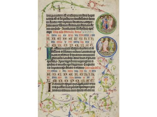 1997. LIBRO. (FACSÍMIL). EL MARTIROLOGIO DE USUARDO. Barcelona: Moleiro, 1997. Folio. Volumen de facsímil enc. en plena piel, nervios, ruedas doradas en ambos planos, presentado en estuche de piel. Se acompaña del volumen de estudio. Edición numerada de 987 ejemplares, con acta notarial. Este manuscrito ocupa un lugar clave en la historia de la pintura centroeuropea. Martirologio de Usuardo recorrió una larga trayectoria antes de llegar a Girona, su actual ubicación. Su origen es Praga, en la corte del rey de Bohemia y emperador Wenceslao IV, de donde pasó a Austria, Moravia y Hungría, Roma e incluso Madrid. Es considerada unánimemente la obra más fastuosa del gótico internacional.