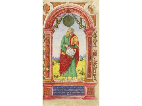 2005. LIBRO. (FACSÍMIL). LE PETIT PROLOMEO. Burgos: Ed. Gil de Siloé, 2005. 4º mayor. Extraordinaria réplica del único Ptolomeo con un tamaño razonablemente manejable y cuyo original se conserva en la Biblioteca Nacional de Francia. Unas 600 p. aprox. en el que se reproduce con oros, platas y vivos colores los textos y mapas del magnífico manuscrito del s.XV. Enc. en terciopelo con refuerzos y cierres metálicos y flores de lis metálicas en los planos, presentado en un elegante estuche de terciopelo, con guantes de algodón. Sin el libro de estudio. Con el acta notarial.
