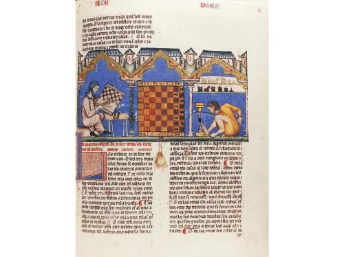 1987. LIBRO. (FACSÍMIL). LIBROS DE AXEDREZ, DADOS ET TABLAS. Valencia: Vicent Garcia Editores, 1987. Folio mayor. 100 h. imitación pergamino con el facsímil cuyo manuscrito original se encuentra custodiado en la Biblioteca de El Escorial. Enc. plena piel. [Más:] Transcripción completa del texto y estudios complementarios. Folio mayor. Enc. media piel, hierros secos en ambos planos y lomera, media piel el libro de estudio. Los dos volúmenes presentados en un estuche de tela.