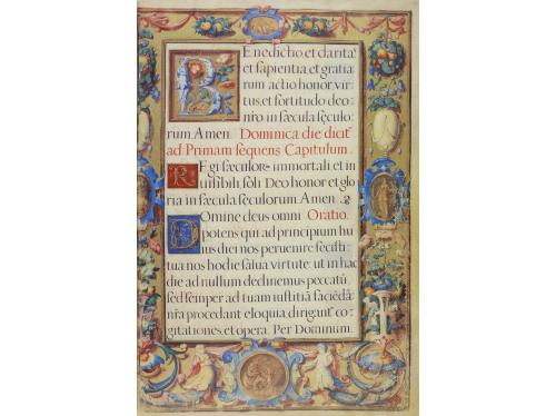 2000. LIBRO. (FACSÍMIL). LIBER TRIUM OFFICIORUM EX SALOMONE SECUNDUM USUM CAROLI QUINTI IMPERATORIS. Madrid: Testimonio Compañía Editorial, 2000. 4º. Reproducción del documento custodiado en la Biblioteca Real del Monasterio de El Escorial. Enc. en plena piel, con decoraciones gofradas y doradas en los planos, nervios, cortes dorados. Con acta notarial que certifica una edición de 980 ejemplares. Con el libro de estudio, ambos presentados en una petaca de tela.