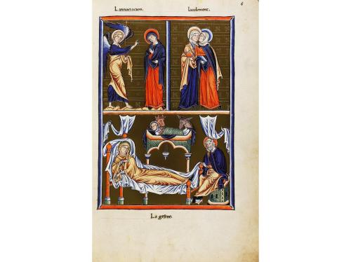 1997. LIBRO. (FACSÍMIL). LIBRO DE HORAS DE JACOBO IV. Madrid: Ed. Casariego, 1997. 8º mayor. Edicón facsímil del original custodiado en la Biblioteca Nacional de Austria con la signatura M 1897. Más de 180 h. con la reproducción sobre papel imitación pergamino, de las miniaturas bellamente coloreadas y el texto en caligrafía gótica. Enc. en terciopelo con bordado de escudo flanqueado por dos unicornios, en el plano anterior. Se acompaña del libro de estudio y ambos presentados en petaca de tela y cartoné. Con justificación del tiraje que acredita 125 ejemplares.
