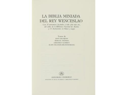 1990. LIBRO. (FACSIMIL-LIBRO ESTUDIO). LA BIBLIA MINIADA DEL REY WENCESLAO. Madrid: Ed. Casariego, 1990. 4º. 179 p. + 2 h. Enc. en tela edit. estampada, con una lám. a color sobrepuesta y protección. Es sólo libro de estudio.