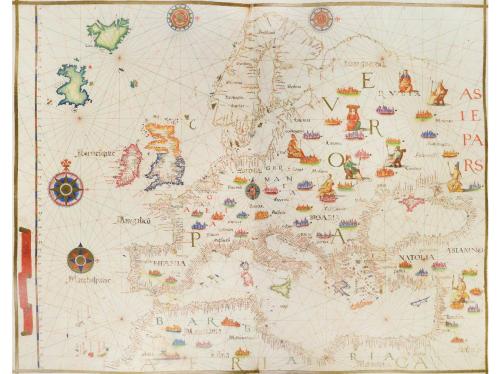 1983. LIBRO. (FACSÍMIL). ATLAS CATALÀ DE 1375. Atlas compuesto por seis hojas sobre pergamino miniadas a mano. Barcelona: Delstres (a partir de planchas del librero y editor barcelonés Porter), 1983. Edición limitada numerada a 75 ejemplares. Facsímil iluminado a mano por expertos miniaturistas, sobre 6 hojas de pergamino de 64 x 50 cm. Incluye la hoja de justificación del tiraje. En siete colores vivos, oro y plata, tal como es el original de este célebre Atlas. El Atlas Català de Abraham Cresques, y de su hijo Jafuda, es el máximo exponente de la cartografía marítima del siglo XIV. Fechado en 1375, es fruto de los conocimientos de muchos pilotos, que solían frecuentar los baños que el judío Abraham Cresques regentaba en la ciudad de Palma. Esto unido a su fama como experto miniaturista de libros y cartas marinas, hizo que le fuera encargado este trabajo.