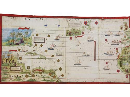 2003. LIBRO. (FACSÍMIL). ATLAS MILLER. Barcelona: Ed. Moleiro, 2006. Mapa impreso en grueso papel imitación pergamino de 63 x 120 cm y 5 hojas del mismo material, de 42 x 59 cm cada una. Iluminadas con abundantes dorados. Presentado en un estuche de seda en forma de prisma para el mapa grande que se presenta enrollado, y otro estuche para las láminas. Edición limitada a 987 ejemplares, con acta notarial. Se acompaña de un libro de estudio.